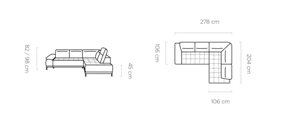 Подглавниците с регулиране на височината осигуряват допълнителен комфорт и индивидуална настройка според предпочитанията на всеки потребител. Повдигнатата конструкция на крачета придава усещане за лекота и стил, като същевременно улеснява поддържането на хигиена под дивана.