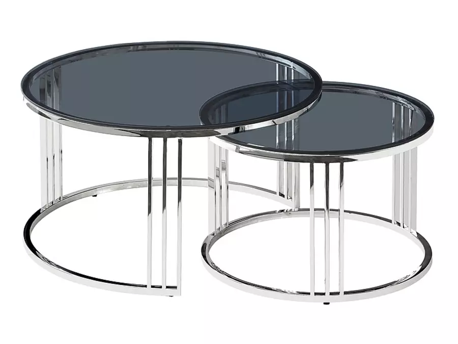 Комплект от 2бр. холни маси ВИЕННА в цвят сребърна основа и опушено стъкло. Размер на маса 1: Ø80xh45 см. Размер на маса 2: Ø60xh40 см.