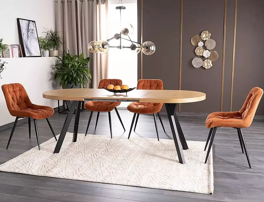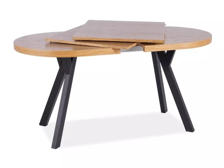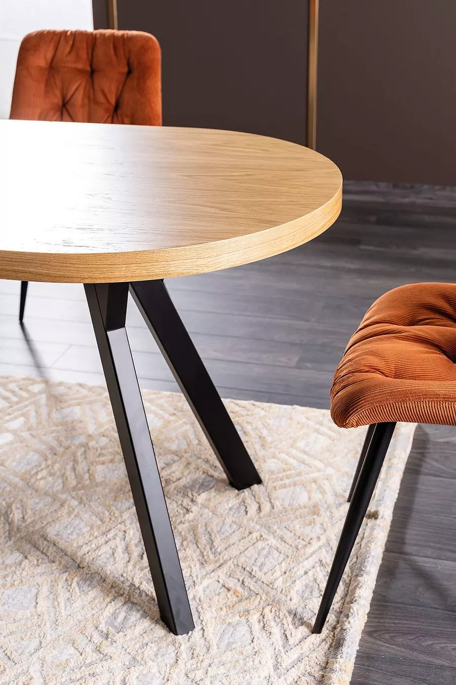 Плотът на масата е изработен от висококачествен естествен фурнир от MDF в цвят дъб, който придава топлина и уют, като същевременно създава стилен акцент в интериора на вашата трапезария. Стабилността на масата е гарантирана от здравите метални крака, които са прахово боядисани в черно, осигурявайки издръжливост и модерен индустриален вид.