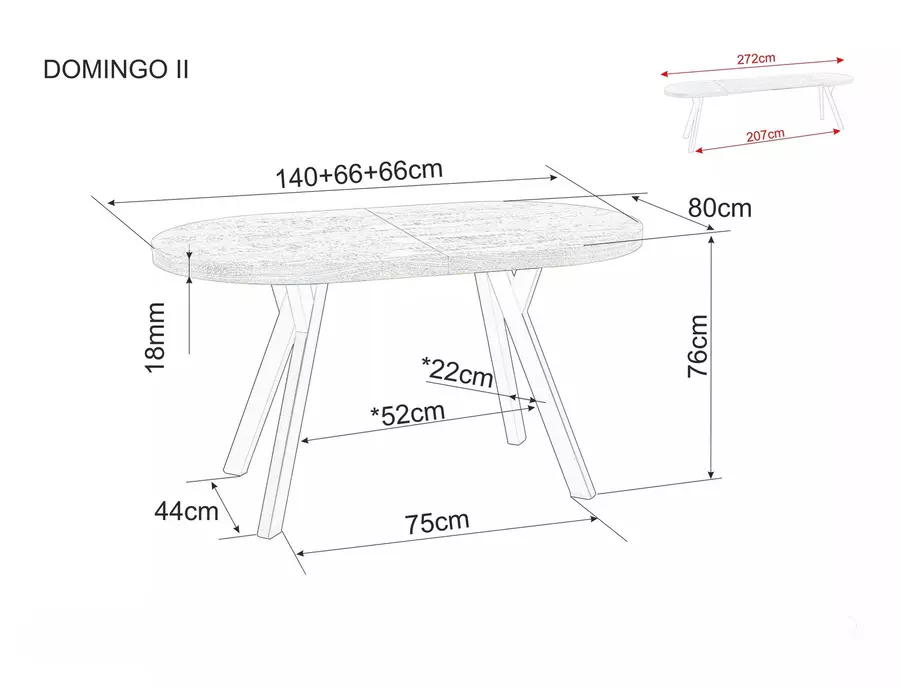 Трапезната маса ДОМИНГО II е идеалният избор за съвременния дом, съчетавайки елегантен дизайн и практичност. С широчина 140 см в стандартно положение, тя предлага комфортно пространство за ежедневни хранения. Но когато е необходимо, благодарение на разтегателния механизъм, масата може да се удължи до 272 см с помощта на два отделни плота по 66 см всеки, което я прави идеална за семейни събирания и специални поводи.