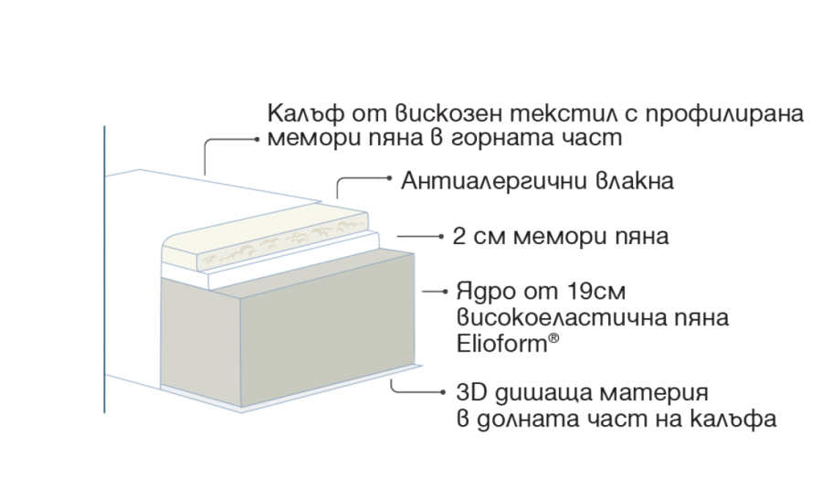 Ядрото на матрака е изработено от 19 см високоеластична пяна Elioform, която предоставя стабилна опора за тялото по време на сън. Ядрото е обгърнато от слоеве мемори пяна, която обгръща тялото и гарантира комфорт през цялата нощ. Тежестта се разпределя равномерно в 5 основни точки на досег между тялото и матрака - глава, рамене, гръб, крака и глезени. По този начин се осигурява правилна позиция и опора.