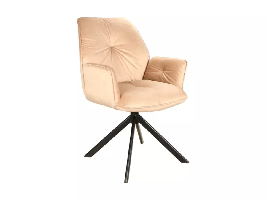 Черните крака на креслото подчертават елегантния му и съвременен стил, като същевременно осигуряват здравина и устойчивост. Уникалната функция за въртене на седалката на 180 градуса, съчетана с механизъм за автоматично връщане в изходна позиция, прави креслото не само стилно, но и изключително практично. Конструкцията е проектирана така, че да издържа натоварване до 120 кг, което гарантира надеждност и дълготрайна употреба. Това кресло е идеално за създаване на уют и комфорт в дневната, спалнята или офис пространството.
