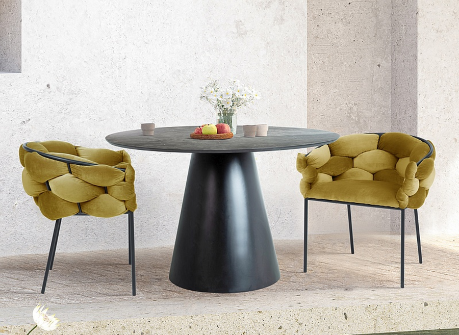 Масата е изработена от мдф за основа и крака. Плотът е изработен от ламиниран мдф с ефект мрамор.