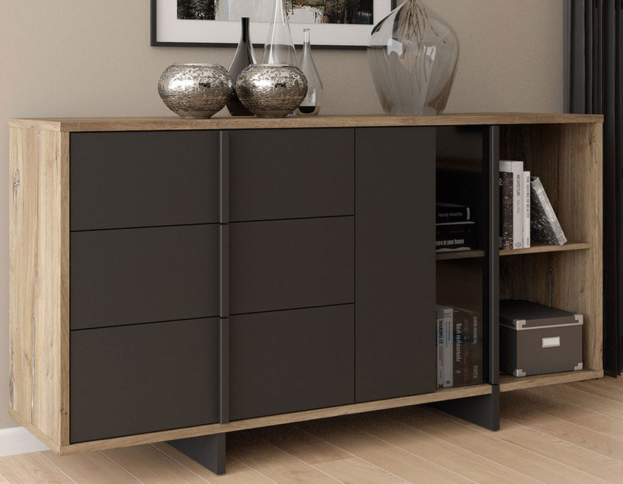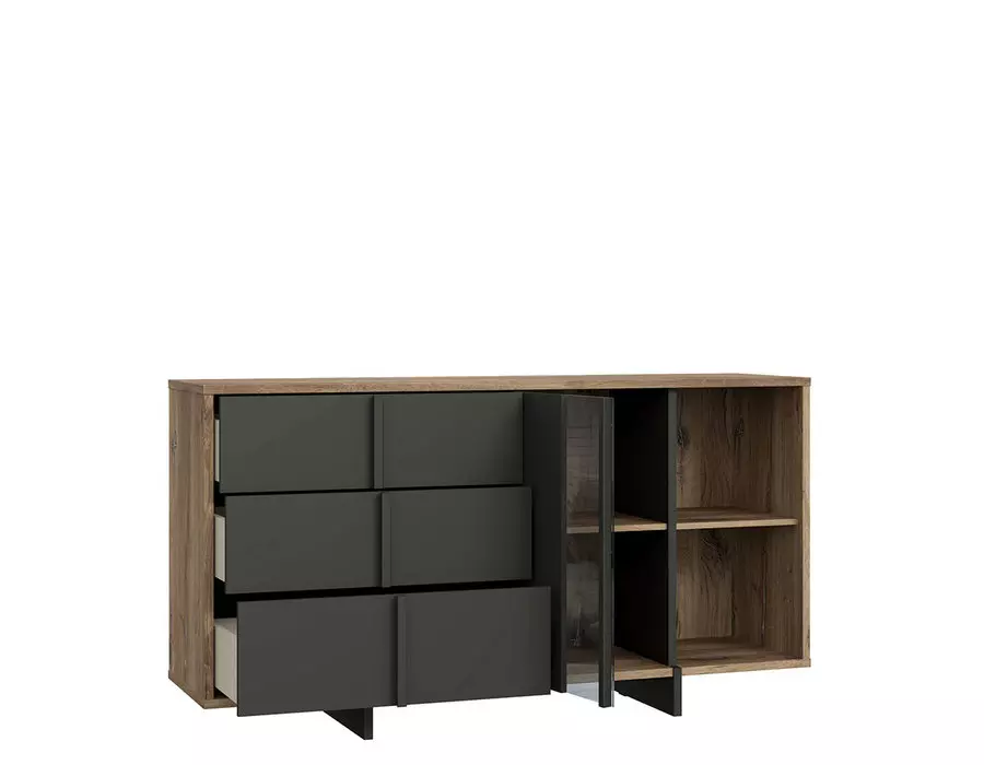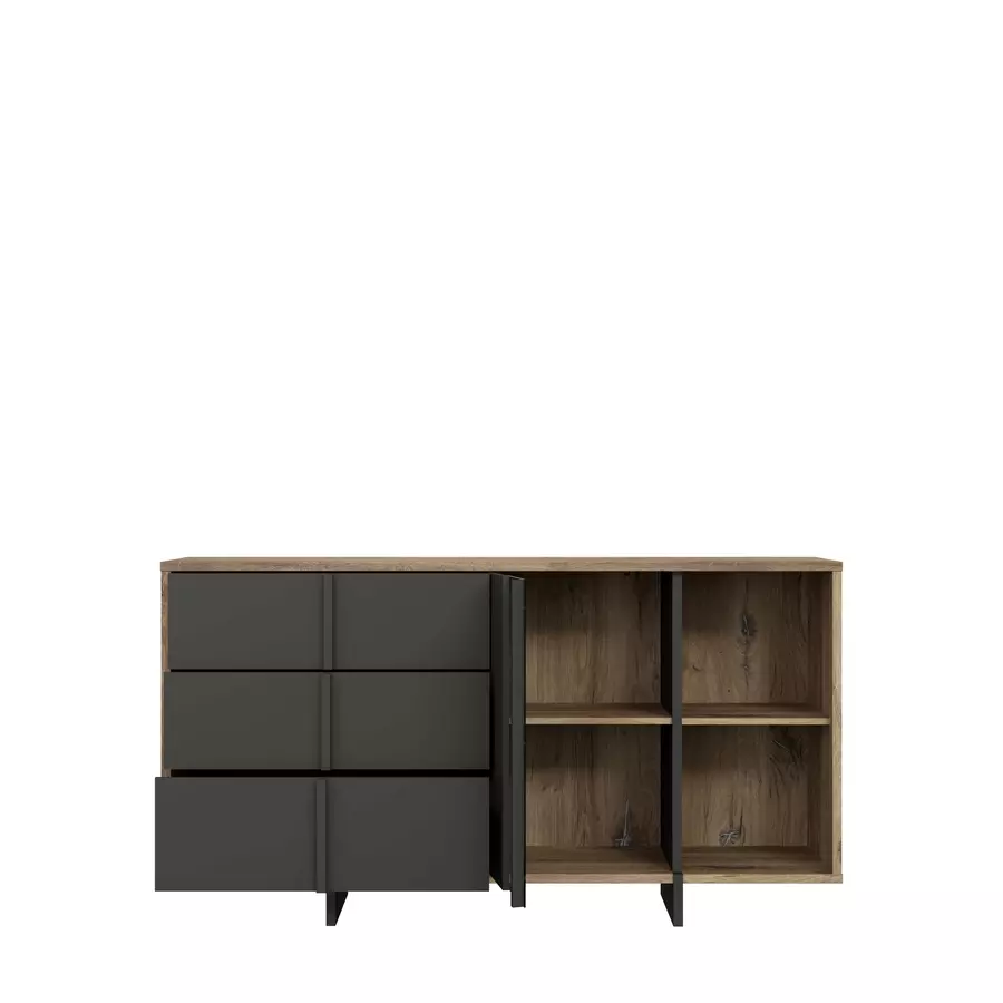 Бюфетът от колекция "Джоказ" съчетава модерен дизайн и практичност. Изработен от 18 мм ламинирано ПДЧ, той предлага просторни отделения с врата и чекмеджета, оборудвани с механизъм за плавно затваряне. С размери 86 см височина, 160 см широчина и 42 см дълбочина, бюфетът е идеален за съхранение и организация на вещи. Допълнително се предлага LED осветление, което подчертава елегантния му стил. Част от модулната система "Джоказ", той се комбинира лесно с други мебели от серията, създавайки хармоничен интериор