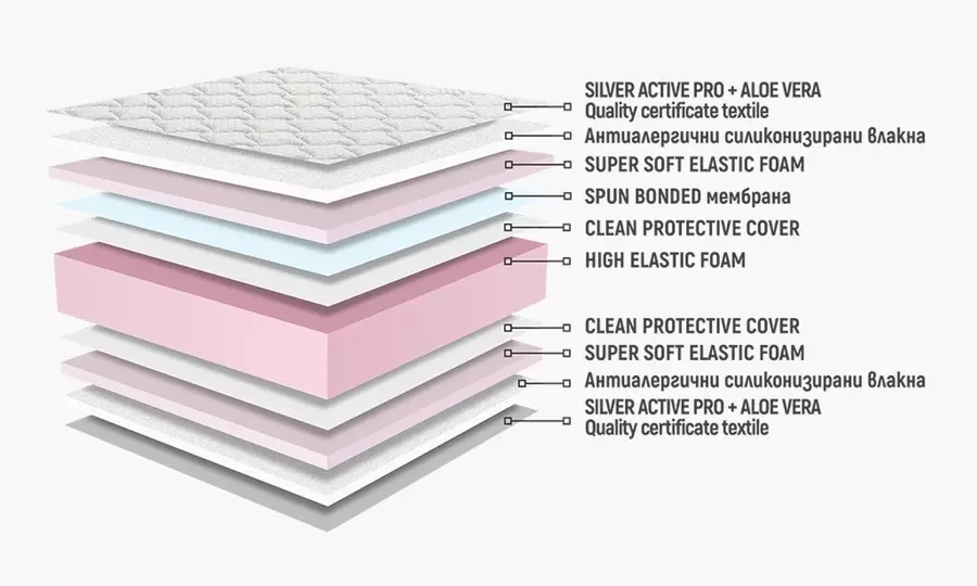 HIGH ELASTIC FOAM предлага необходимата балансирана ортопедичност. За липсата на точки със свръх напрежение, в контактната с тялото зона е добавен SUPER SOFT ELASTIC FOAM. Структурата на сърцевината от „отворени“ клетки и 3D дишаща лента създава оптимална система за максимална проветривост и вентилация на влагата и в дълбочина.