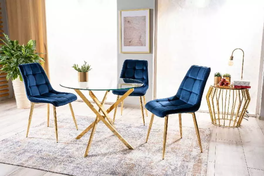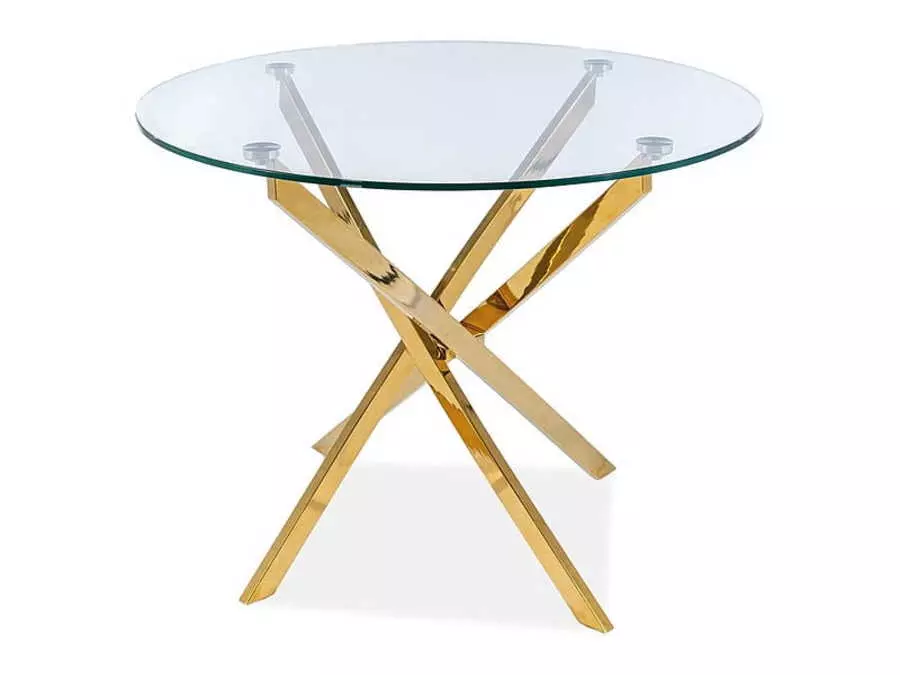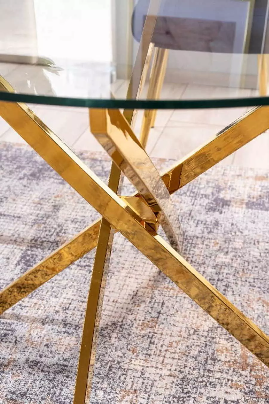 Основата на масата е изработена от висококачествен златист метал с уникална кръстосана конструкция, която осигурява стабилност и изразителен визуален ефект. Блестящата метална основа не само допълва стъкления плот, но и добавя модерна нотка, която прави масата идеална за интериори с акцент върху съвременния дизайн.