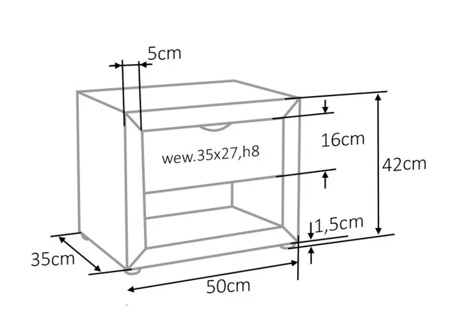 Нощно шкафче ЕТ 001 КАДИФЕ предлага удобна повърхност за поставяне на лампа, аксесоари или книги, а компактните му размери го правят подходящо както за по големи, така и за по малки помещения. Моделът се отличава с широчина петдесет сантиметра, височина четиридесет и два сантиметра и дълбочина тридесет и пет сантиметра, което осигурява практично пространство за подреждане без да заема излишно място.