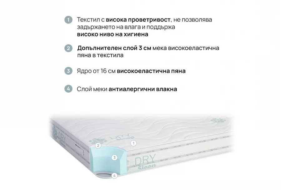 Антиалергичният текстил осигурява суха среда за сън и предпазва от задържане на влага в матрака. Високата проветривост позволява постоянна циркулация на въздух и възпрепятства задържането на прах.