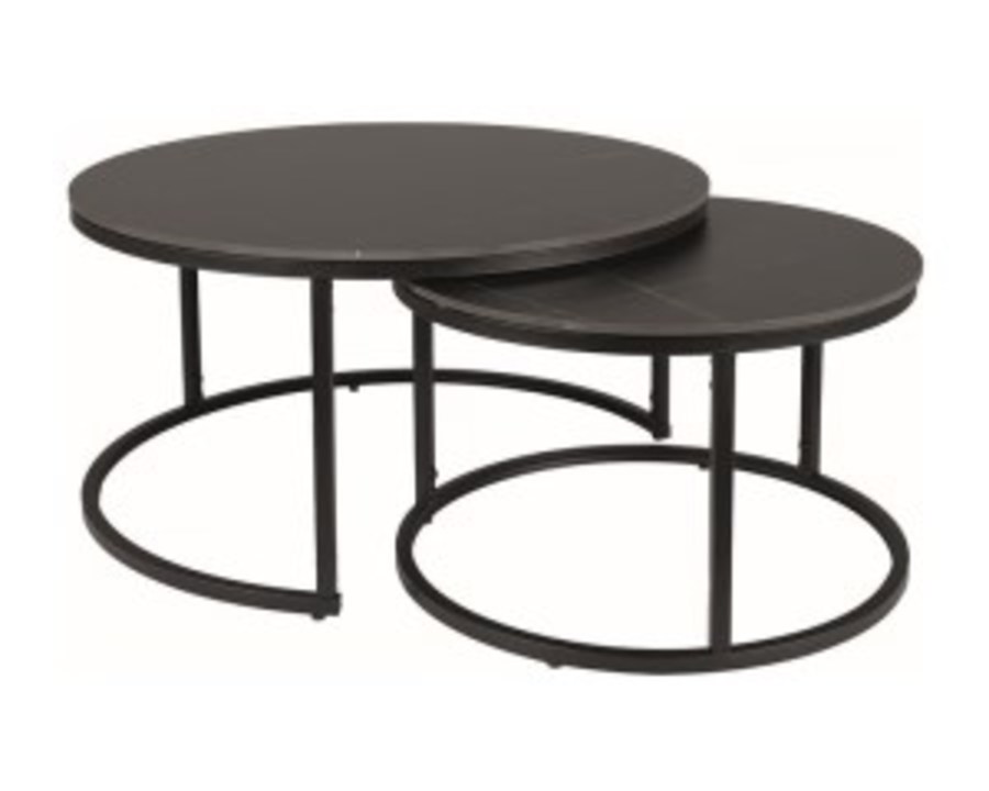 Комплект от 2бр. холни маси ФЕРРАНТЕ D са изработени от ПДЧ плот имитиращ черен мрамор и метална основа в цвят черен мат. Размери: - Маса 1:Ø80xh42 см - Маса 2 :Ø60xh38 см