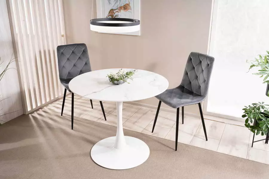 Трапезна маса ЕСПЕРО е перфектно решение за малки пространства. Изработена в бял цвят с керамичен плот. Допустими са отклонения или несъответствия от действителните цветове на продукта, с тези на екрана на Вашето устройство.