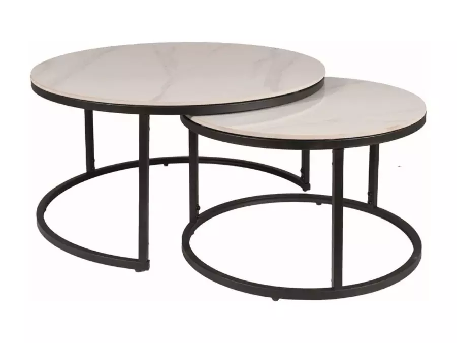 Комплект от 2бр. холни маси ФЕРРАНТЕ С са изработени от ПДЧ плот в цвят имитиращ бял мрамор и метална основа.