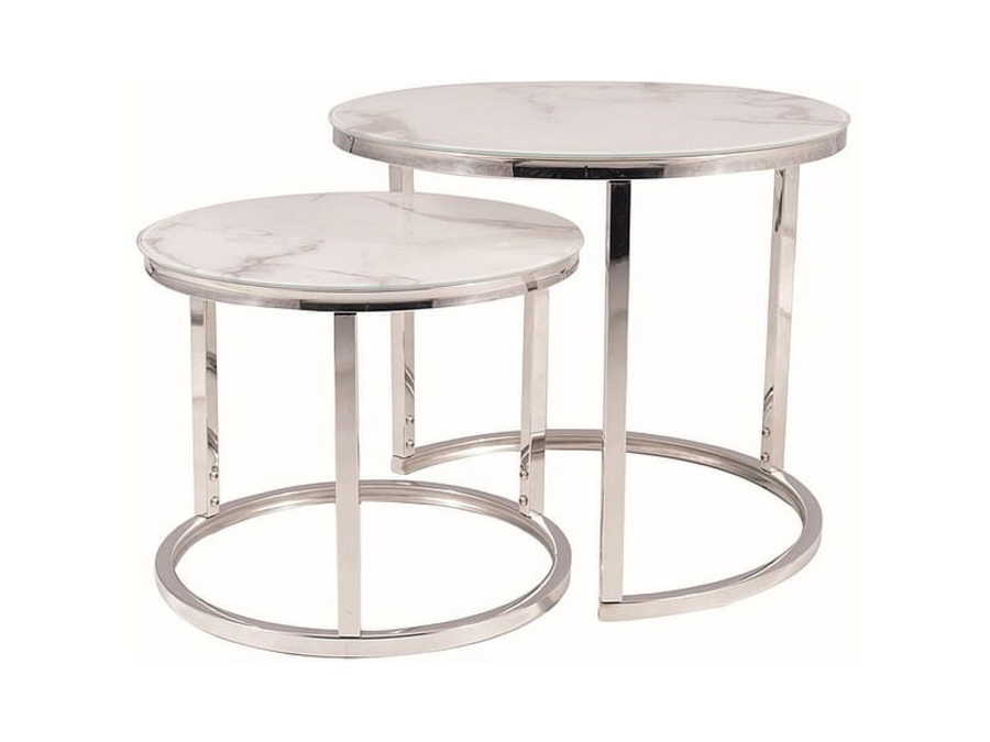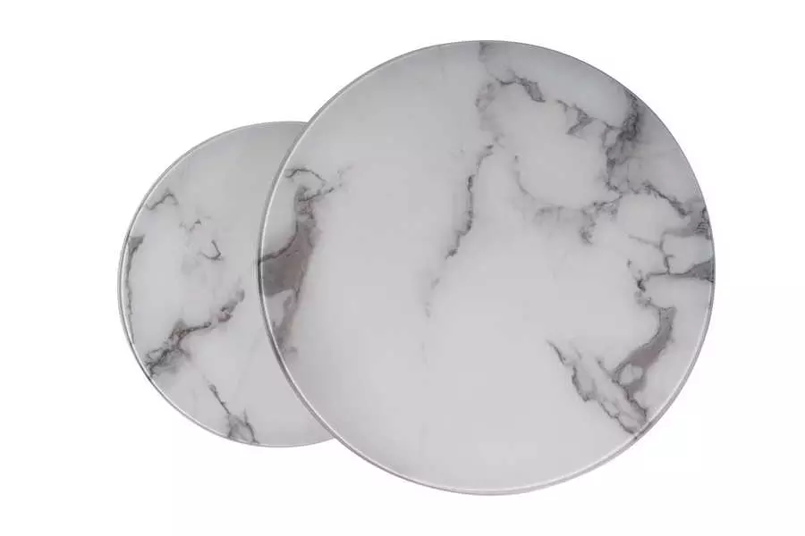 Комплект от 2бр. холни маси АТЛАНТА B II са изработени от темперирано стъкло имитиращо бял мрамор и метална основа.