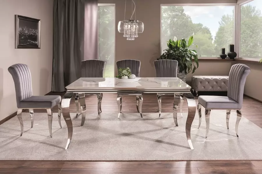 Конструкцията на масата се отличава със здрава метална основа с хромирано покритие, което добавя блясък и устойчивост на износване. Извитите линии на краката придават уникален характер и усещане за разкош, подчертавайки класическите детайли в съвременен прочит. Масата е стабилна и надеждна, съчетавайки функционалност и стил.