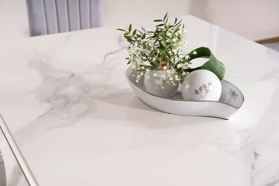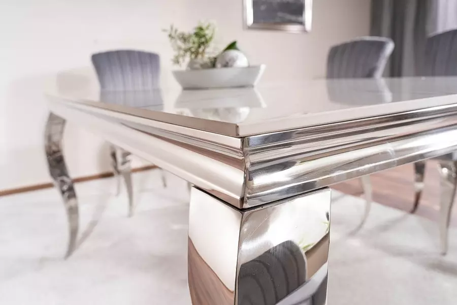 Трапезна маса ПРИНС впечатлява със своя луксозен и елегантен дизайн, който съчетава модерни материали с класически акценти. Плотът е изработен от висококачествена керамика, която придава изтънченост и създава усещане за простор и светлина в помещението. Освен естетиката, стъкленият плот е изключително издръжлив и лесен за почистване, което го прави практичен избор за всяко домакинство.