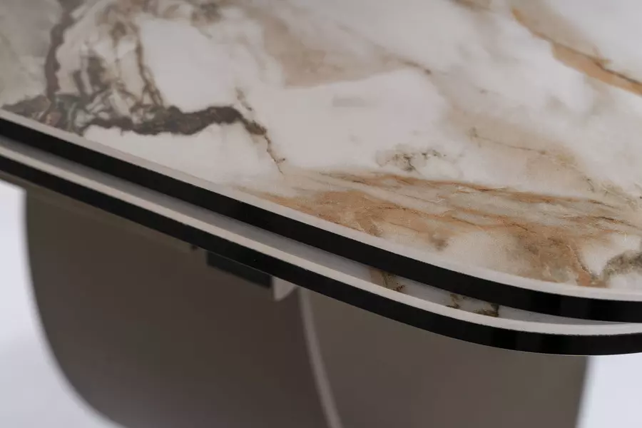 Трапезна маса ИНФИНИТИ КЕРАМИК е изключително стилно и практично решение за вашата трапезария, съчетаващо модерен дизайн и функционалност. Плотът с мраморен ефект в цвят AMBER BIANCO създава усещане за елегантност и изтънченост, като перфектно се съчетава с кафявата метална основа. Изработен от комбинация от закалено стъкло и испанска керамика, плотът осигурява здравина, устойчивост и лесна поддръжка.