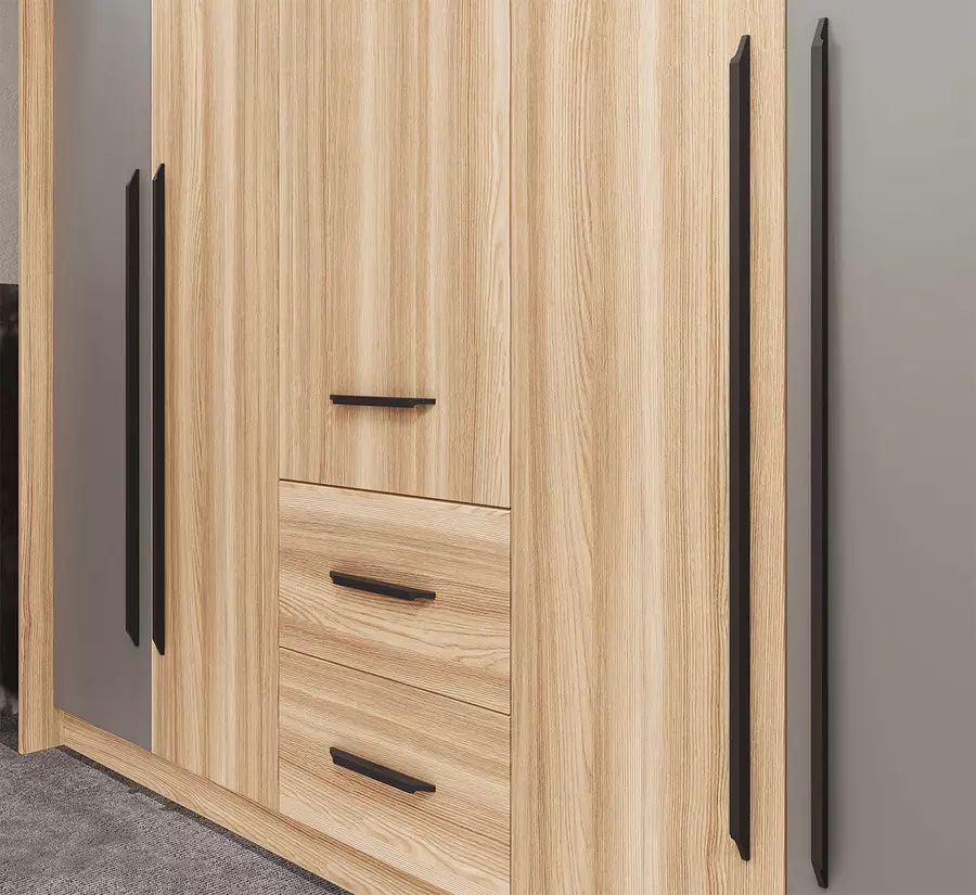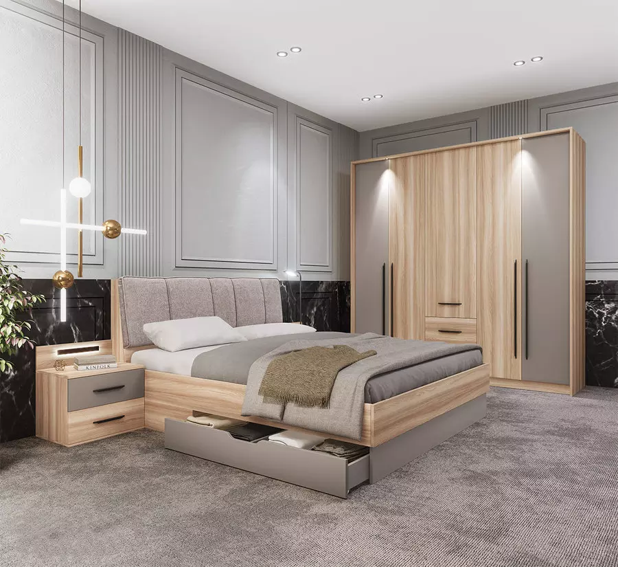 Спален комплект Mikaela е изцяло изработен в комбинация от 18мм лпдч блонд сърфейс и мдф лате мат. Гардеробът има изключително разчупено и удобно разпределение съчетавайки рафтове, лостове с различна височина и чекмеджета. Добавено е ЛЕД осветление, както на него, така и на нощните шкафчета. Спалнята е снабдена с чекмеджета от двете страни и много удобна тапицирана табла в бежова висококачествена дамаска. Включено е също така плавно затваряне на вратите