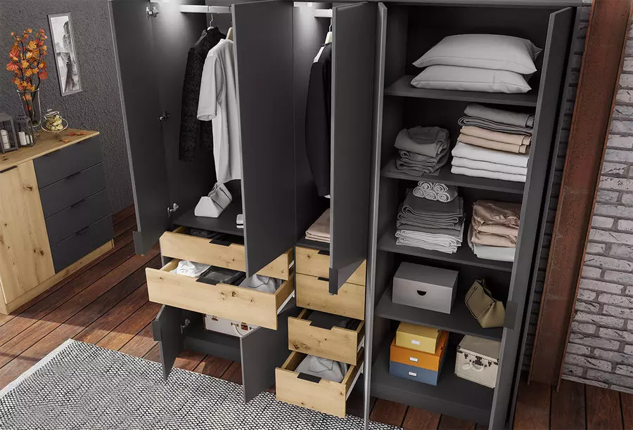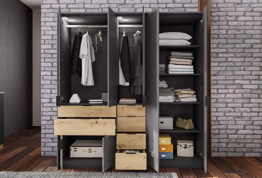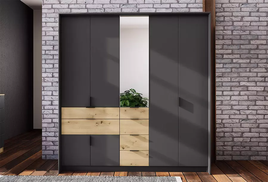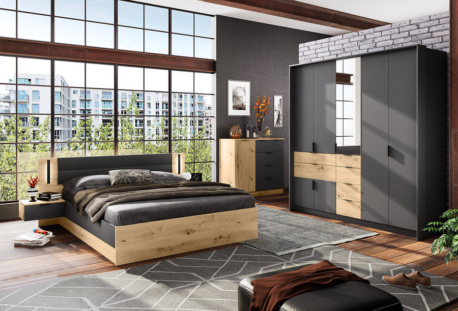 С нововъведен декор дъб артисан постигнахме модерна и изчистена визия на нов спален комплект Сити 7081. Спалнята има включен повдигащ механизъм и много интересно метално лед осветление на таблата. Гардеробът е изключително комплексен и включва много различни пространства с лостове, рафтове и многобройни чекмеджета. Скринът е част от комплекта.