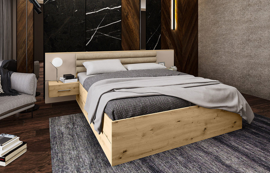 Много стилен нов модел в чудесно съчетание на нововъведени декори дъб артисан и мдф кашмир гланц. Леглото е с инетерсна голяма табла, на която са положени нощните шкафчета. Тапицерията наподобява кашмир и е в абсолютен унисон с цялостната визия на комплекта.