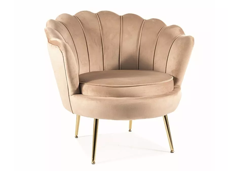 Фотьойл КАМЕЛИЯ 1 ВЕЛВЕТ е тапициран с кадифена дамаска в цвят бежово, крачетата на фотьойла са метални в златен цвят.