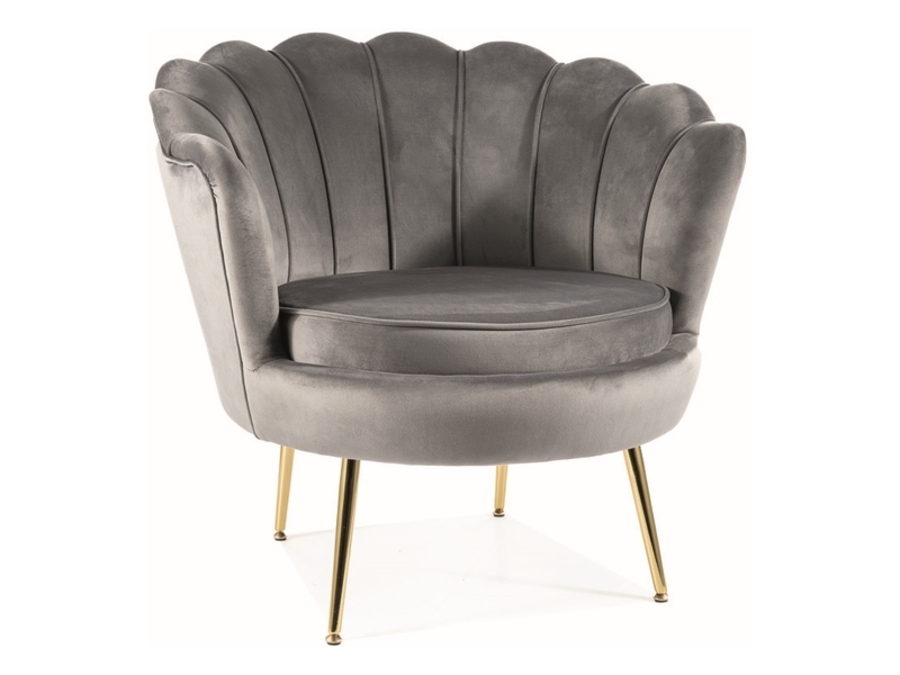 Фотьойл КАМЕЛИЯ 1 ВЕЛВЕТ е тапициран с кадифена дамаска в сив цвят, крачетата на фотьойла са метални в златен цвят.