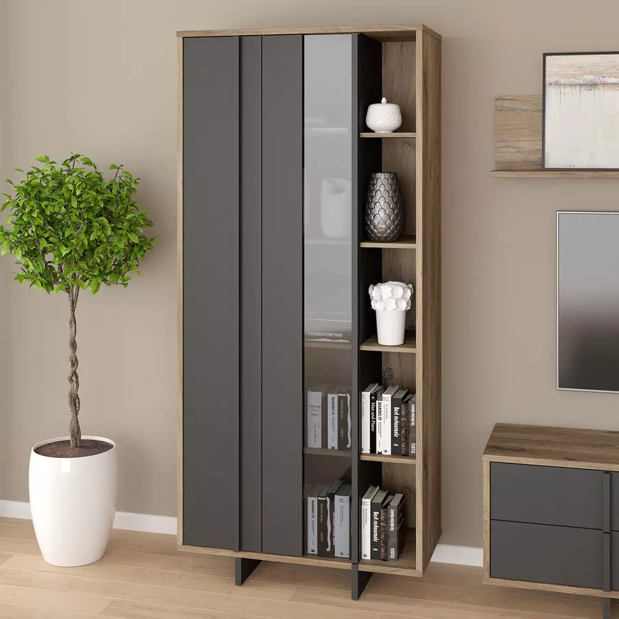 Витрина ДЖОКАЗ е стилно и практично решение за вашия дом, което съчетава съвременен дизайн с висока издръжливост. Изработена е от 18 мм ламинирано ПДЧ, което гарантира дълготрайност и лесна поддръжка. Вратите на витрината са снабдени с механизъм за плавно затваряне, който осигурява безшумно и удобно затваряне, предпазвайки мебелта от износване.