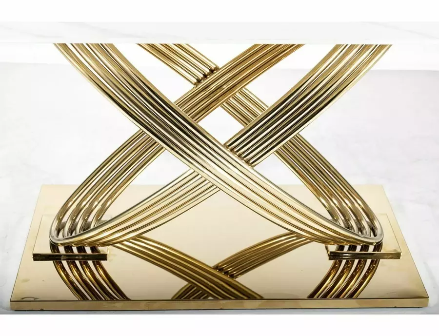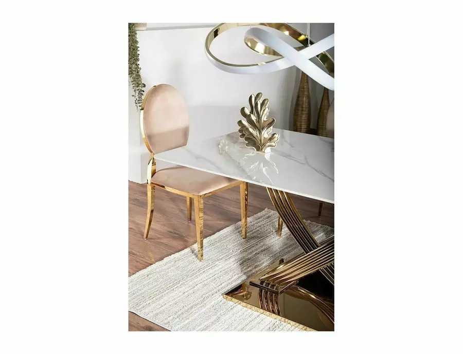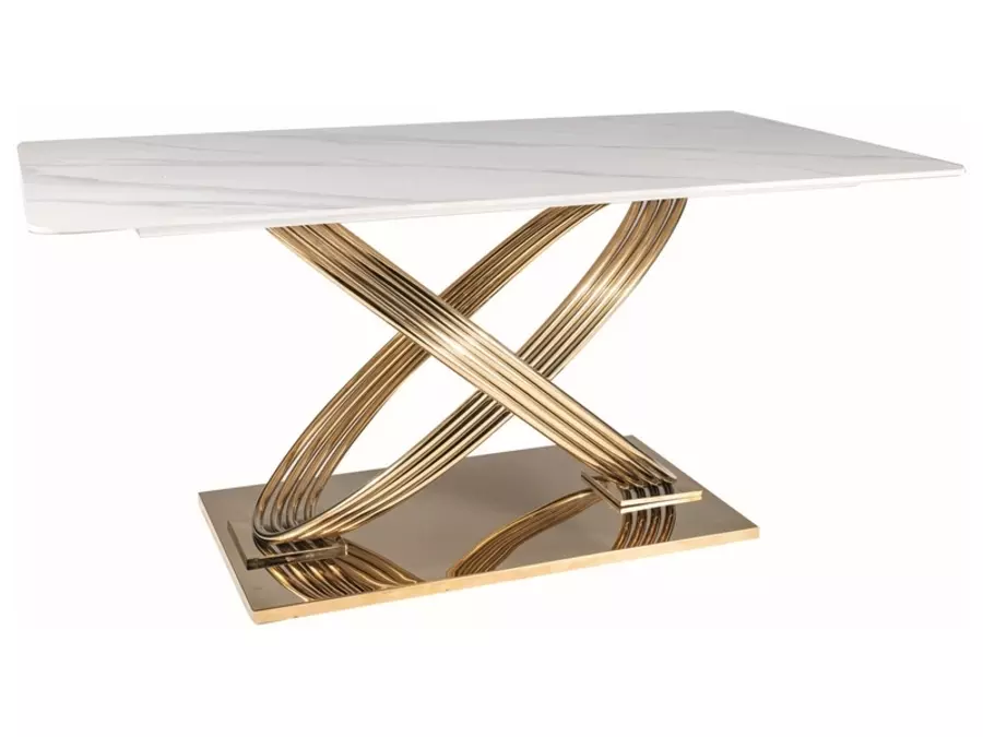 Трапезна маса ХЕРМЕС е изработена с бял керамичен плот с мраморен ефект, а основата на масата е метална в цвят златен.