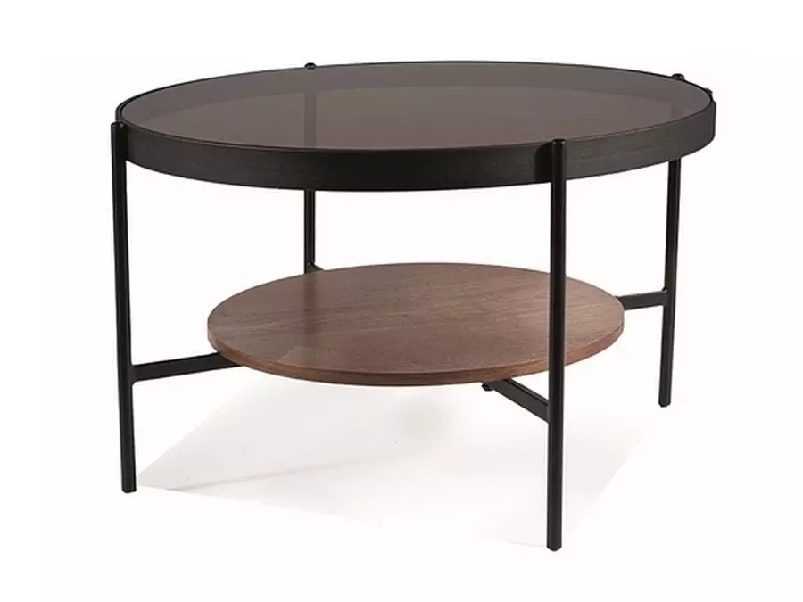 Холна маса ПРИМА Б е изработена с два плота. Горния плот е стъклен, а долния е изработен от МДФ плоскост в цвят орех.