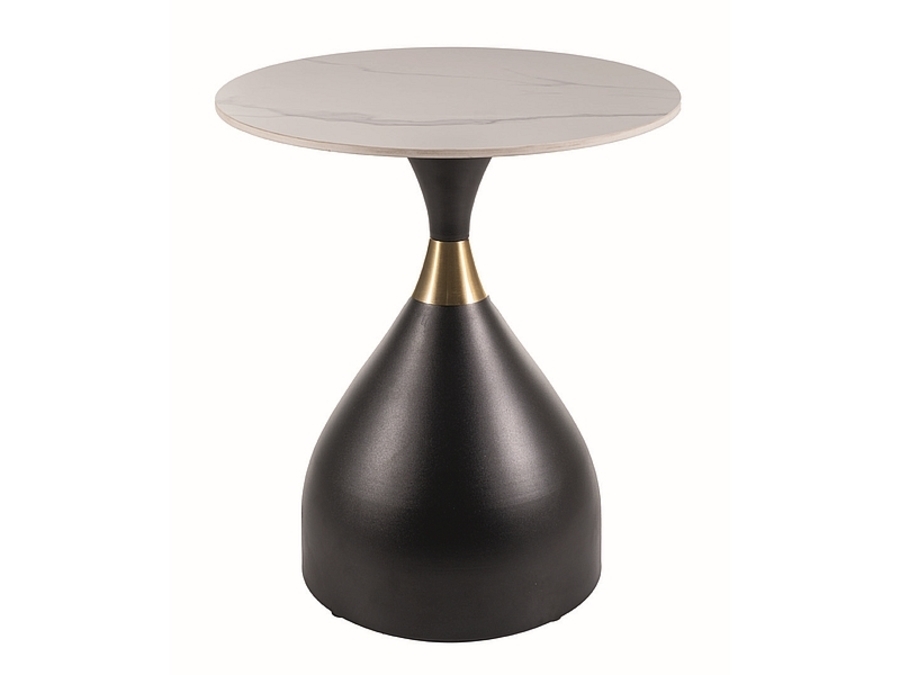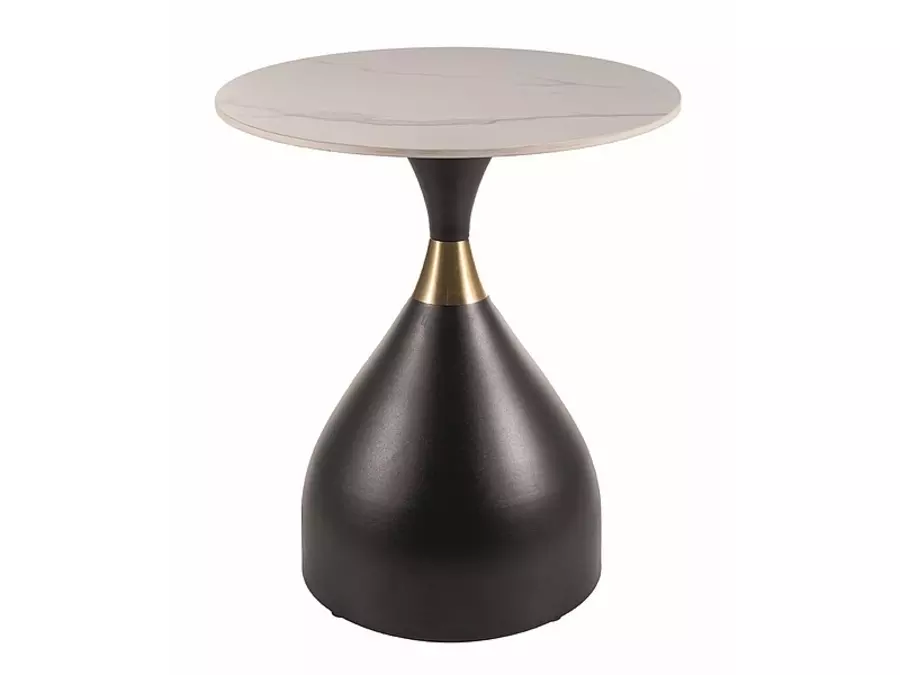 Плотът на масата е керамичен в бял цвят и мраморен ефект. Основата е метална в цвят черен мат. На основата има и елемент в златист цвят.