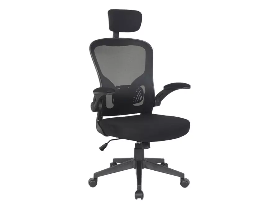 Офис стол Q-060 е тапициран с плат и мрежа в черен цвят.
