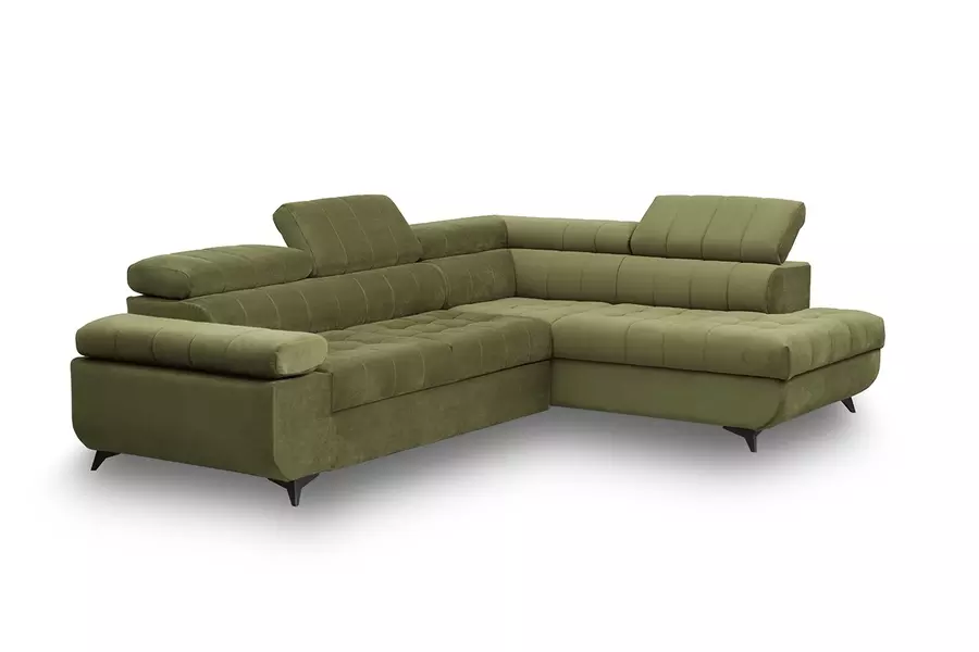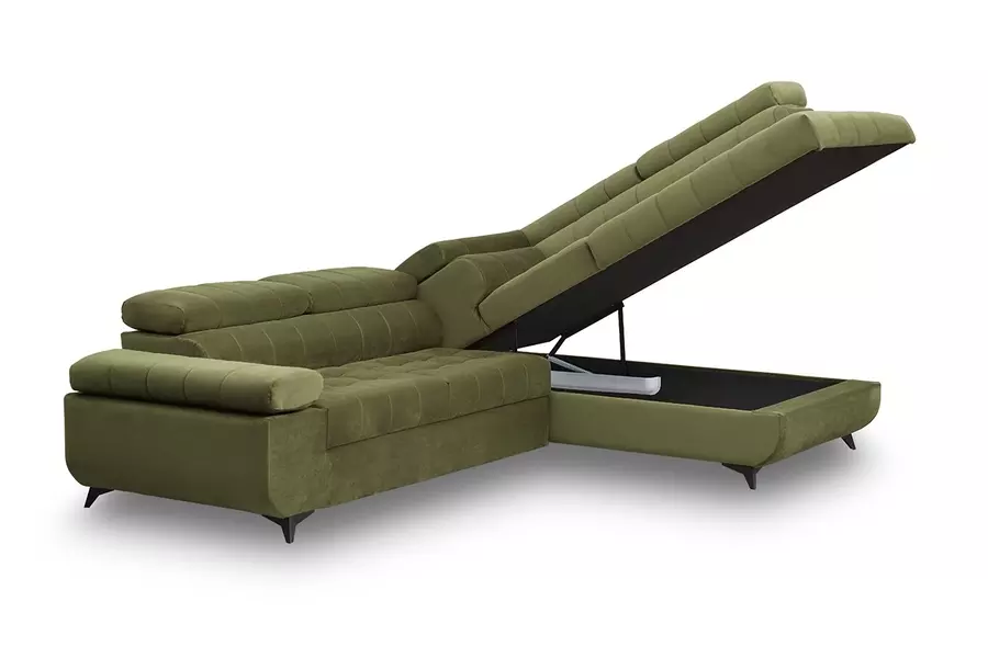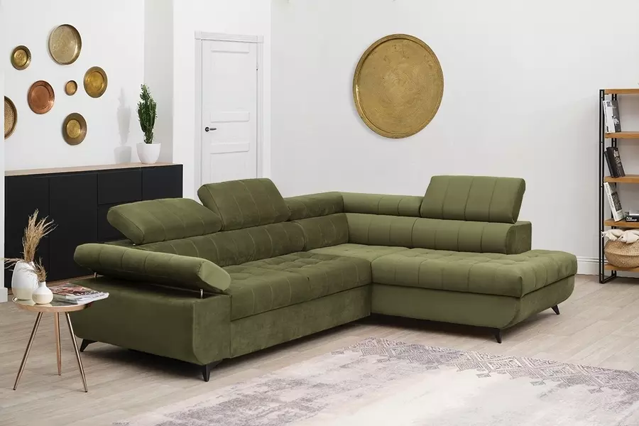 Ъглов диван ДРАГОНИС L е съвременно решение за интериора, съчетаващо висок комфорт, функционалност и елегантна визия. Проектиран с внимание към детайла, моделът разполага с просторна лежанка с голяма ракла за съхранение на спално бельо, възглавници или други вещи, които искате да държите подръка. Благодарение на допълнителното гръбче на лежанката, диванът осигурява повече места за сядане, без да се компрометира удобството.