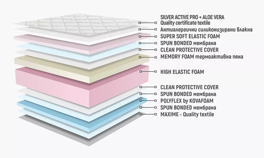 Слой термоактивна мемори пяна: От едната страна на матрака е разположен слой мемори пяна, който реагира на топлината на тялото и се адаптира към индивидуалните му контури. Мемори пяната облекчава натиска върху чувствителни точки като раменете, бедрата и гърба, осигурявайки персонализиран комфорт и усещане за лекота.