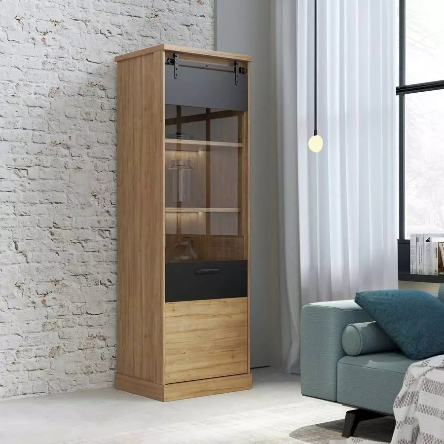 Естествените дървесни тонове и графитните акценти правят витрината подходяща за всякакви интериори, добавяйки модерен и елегантен акцент в помещението, като използване в дневни, трапезарии или дори офиси, витрината предлага както функционалност, така и визуална естетика.
