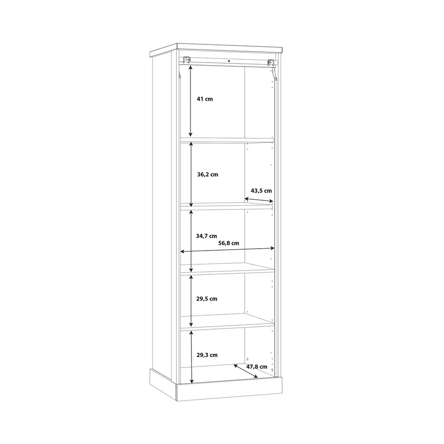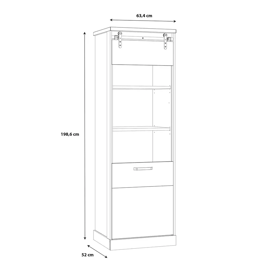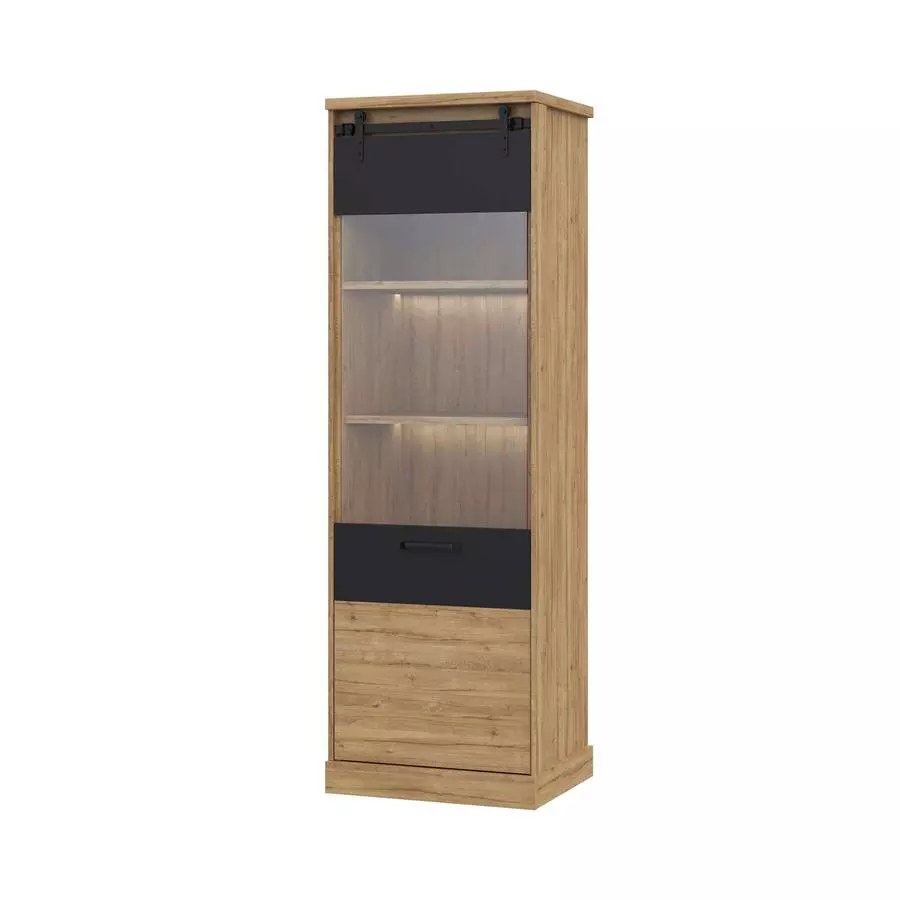 Витрината се отличава с модерни линии и цветови съчетания, които лесно се вписват в съвременен интериор и придават усещане за простор и стил. Витрината предлага комбинация от открито изложение със стъклена врата и закрити рафтове за съхранение на лични вещи.