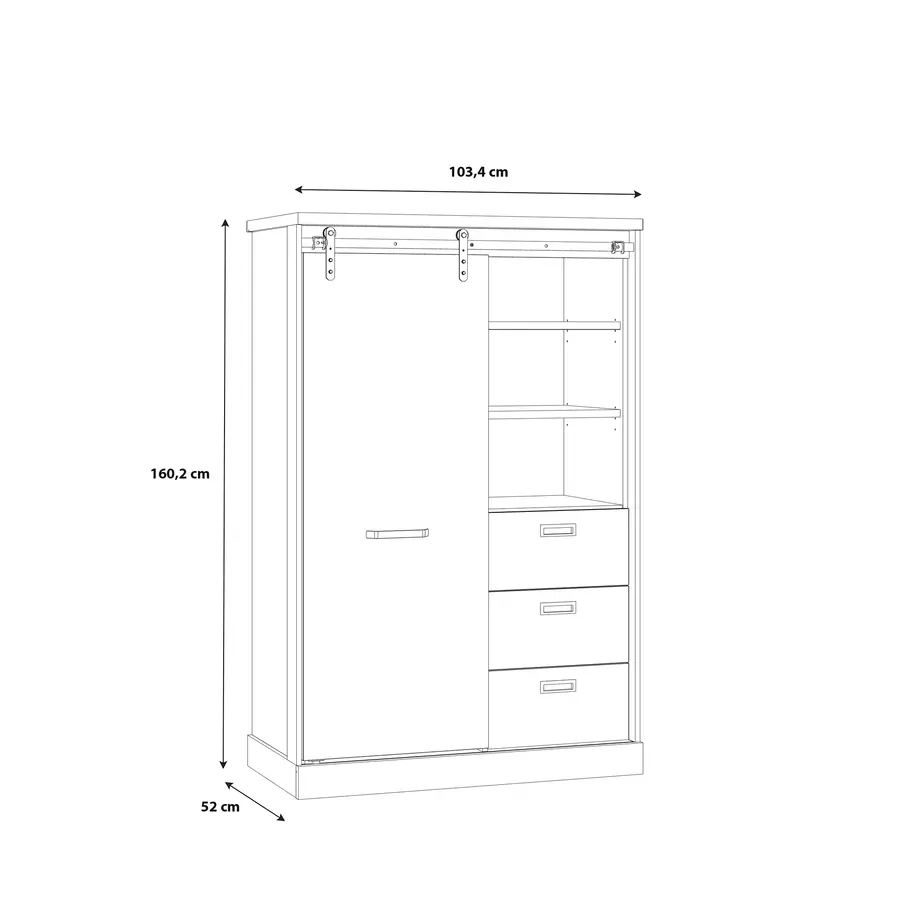 Шкафът разполага с една плъзгаща врата, която осигурява лесен достъп до вътрешното пространство, без да заема допълнително място при отваряне, което го прави подходящ за по-компактни стаи.