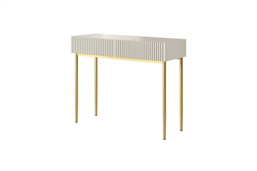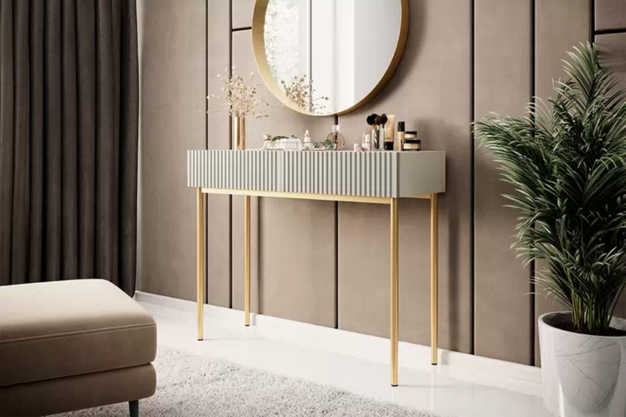 Тоалетка Никол е част от луксозната колекция. Съчетан от най-висококачествени материали , практично разположение и модерна визия се подрежда на първо място . Плавно затваряне на вратите. Корпуса е изработен от 16 мм ПДЧ. Вратите са изработени от 18 мм МДФ ФРЕЗОВАН. Краката са метални с гумена тапичка, височина 67 см. Цвят злато.