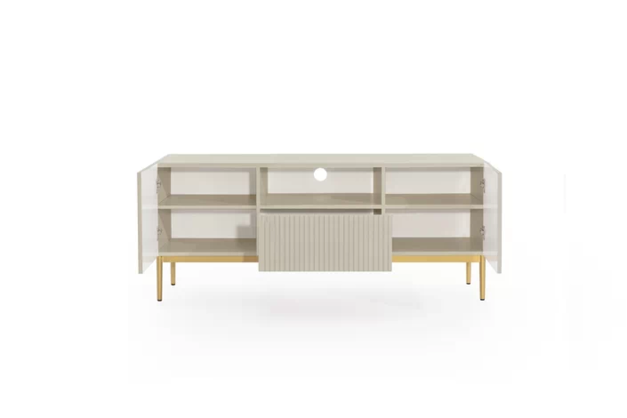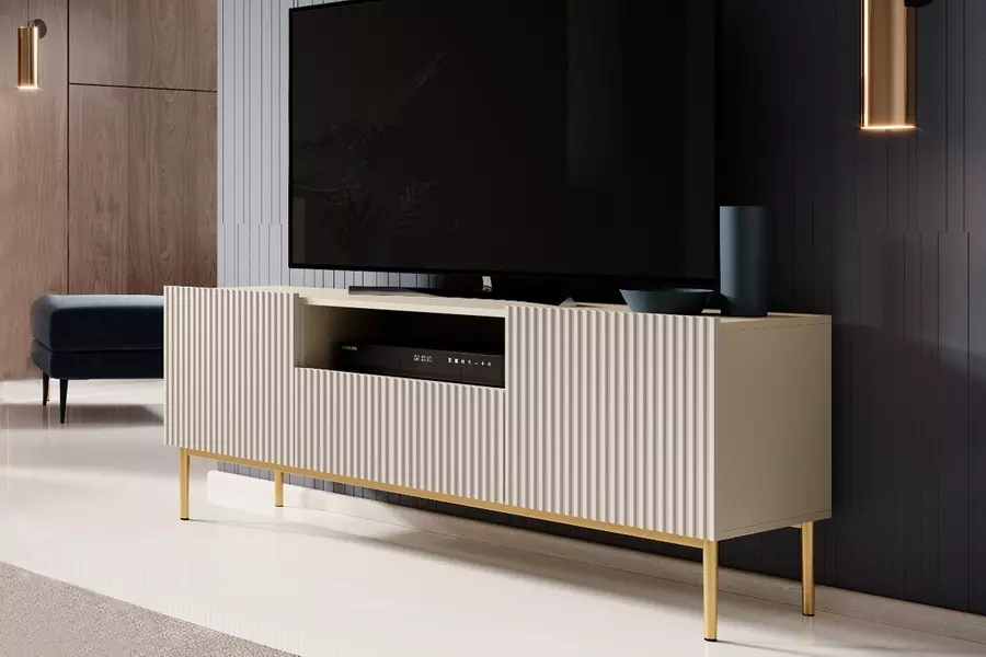Тв шкаф Никол е част от луксозната колекция. Съчетан от най-висококачествени материали , практично разположение и модерна визия се подрежда на първо място . Плавно затваряне на вратите. Корпуса е изработен от 16 мм ПДЧ . Вратите са изработени от 18 мм МДФ ФРЕЗОВАН. Краката са метални с гумена тапичка, височина 20 см. Цвят злато.Дръжки метал. Огледалото не е включено в цената.